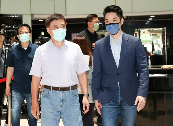 中國國民黨臺北市長參選人蔣萬安(右)昨天拜會臺北市前市長郝龍斌(前左),郝龍斌稱贊他現在對于市政已經非常嫻熟。(圖片來源:臺灣《聯合報》)