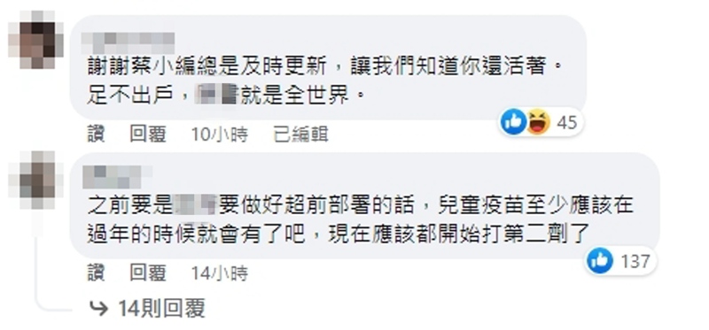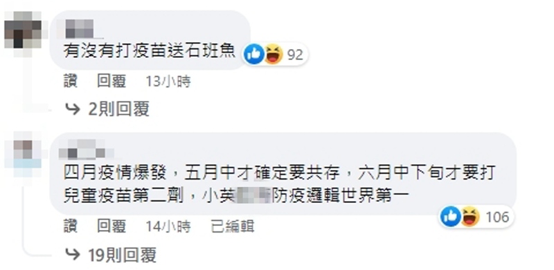 此文一出,立即涌入超過2200條留言,并多為批評聲。有網友表示,“謝謝蔡小編總是及時更新,讓我們知道你還活著”“若你真的努力,兒童疫苗現在應該已開始打第二劑了”“行動后知后覺,嘴巴超前部署”;還有人諷刺,“打疫苗送不送石斑魚?”