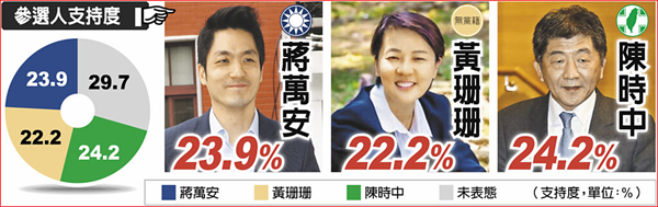 如果最后階段是陳時中第三,則支持度會滑落到13.6%,黃珊珊支持度為26.5%,蔣萬安26.4%,蔣黃兩人誰能勝出仍在未定之天。