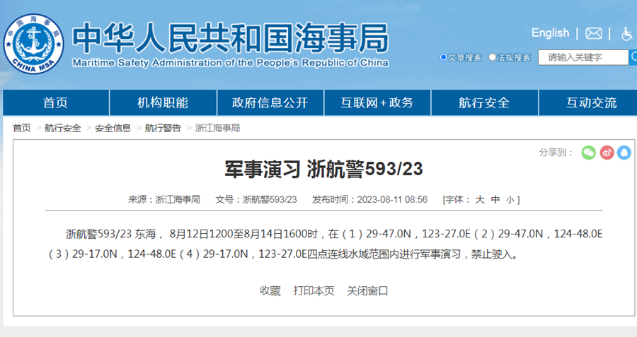 根據公告,浙航警表示,從8月12日中午12點到8月14日下午4點,于下列坐標(1)29-47.0N,123-27.0E(2)29-47.0N,124-48.0E(3)29-17.0N,124-48.0E(4)29-17.0N,123-27.0E四點連線水域范圍內進行軍事演習,禁止駛入。