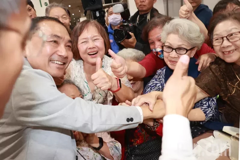 侯友宜(左)出席臺灣觀光產業聯誼餐會,受到與會民眾熱情歡迎,爭相上前握手合影。(圖片來源:臺灣《聯合報》)