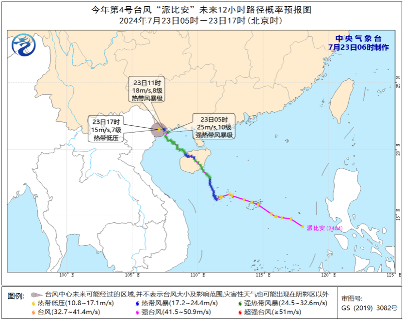 今年第4號臺風“派比安”未來12小時路徑概率預報圖(7月23日05時-23日17時)
