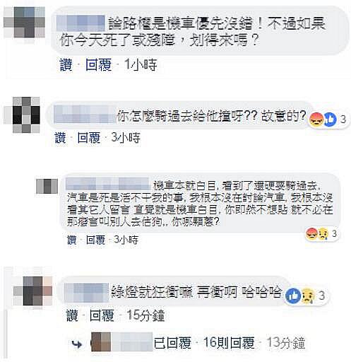 但萬萬沒想到有部分網友看完后竟反酸吳男,“綠燈就狂沖嘛,再沖啊,哈哈哈”、“你怎么騎過去給他撞呀?故意的?”、“明知道車子想過,還硬要直行過,覺得自己路權大自己就對,活該”、“下次遇到砂石車也一樣要用生命捍衛路權哦”。