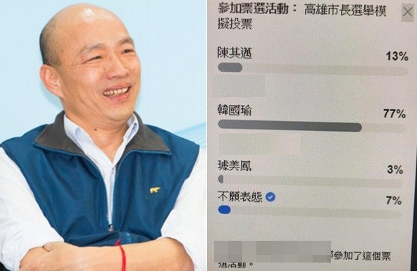 這個名叫“爆料公社”的臉譜網(wǎng)帳號,7日晚間在網(wǎng)絡(luò)上舉行模擬投票活動。結(jié)果出爐后,高雄的模擬選情成為大家關(guān)注的焦點,“賣菜郎”國民黨高雄市長參選人韓國瑜竟以77%得票率大勝陳其邁13%。