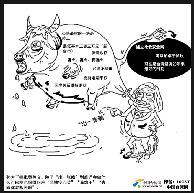 據(jù)臺(tái)灣《中時(shí)電子報(bào)》報(bào)道,臺(tái)灣地區(qū)領(lǐng)導(dǎo)人蔡英文日前在民進(jìn)黨候選人造勢(shì)場合致辭時(shí)呼吁選民,絕對(duì)不能把選票投給“只出一張嘴”、讓臺(tái)灣走回頭路的政黨。國民黨前“立委”孫大千10月29日在臉譜網(wǎng)(facebook)發(fā)文諷刺,蔡英文口中所說的只會(huì)出一張嘴的人,不就是你自己嗎?