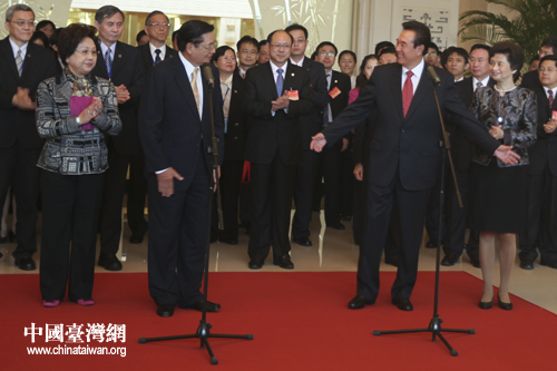 出席第七次兩岸兩會領導人會談的;鶗麻L江丙坤一行今日中午抵達天津,海協會會長陳云林及相關人員在天津迎賓館歡迎;鶗䥇f商代表團的到來。(中國臺灣網 陳佳慧 攝)