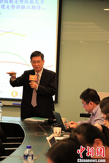 9月30日,臺灣元大寶華綜合經濟研究院在臺北發布2016年臺灣經濟預測,將經濟增長率從0.9%上修至1.1%。知名經濟學者、該院董事長梁國源稱,臺灣經濟恐淪為時有時無的“快閃式復蘇”,就像燈泡亮了一下,但會不會繼續亮并不知道。中新社記者 徐德金 攝
