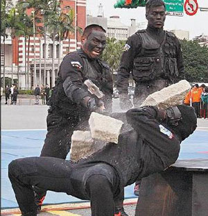 以往神秘的憲兵特勤隊,近年為爭取預算頻頻曝光,還要表演碎大石等“雜技” 。來源:臺灣《蘋果日報》