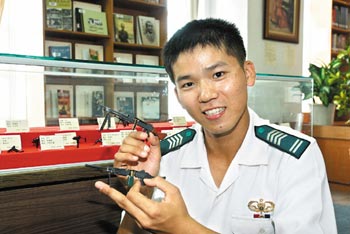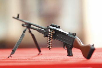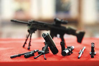 中國臺(tái)灣網(wǎng)6月16日消息 據(jù)臺(tái)灣《聯(lián)合晚報(bào)》報(bào)道,臺(tái)軍陸軍官校管理科學(xué)系四年級(jí)學(xué)生郭晉愷無師自通,用紙張為原料,做出縮小比例,唯妙唯肖的槍支模型。在他的迷你軍火庫中有50多種槍支,都是靠著一把刀、一張紙、瞬間接著劑做出來的,比起日本模型公司出品的槍支模型毫不遜色,陸軍官校還為他舉行個(gè)展。