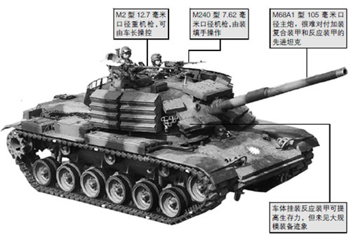 “勇虎”坦克長(zhǎng)約7 米,寬 3.6 米,重近50 噸,乘員4 人,采用M48A3 坦克的炮塔和M60 坦克的底盤整合而成。“勇虎” 的優(yōu)勢(shì)在于裝備了美制M1A1 主戰(zhàn)坦克上配備的彈道計(jì)算機(jī)、熱成像儀、測(cè)距機(jī),具備行進(jìn)間射擊和夜戰(zhàn)能力;劣勢(shì)在于裝甲薄弱,雖曾加裝爆炸反應(yīng)裝甲進(jìn)行測(cè)試,但并未全面換裝。顯然,“勇虎”的任務(wù)不是和先進(jìn)坦克對(duì)決,而是充當(dāng)“機(jī)動(dòng)火炮”用于火力支援。(何西)