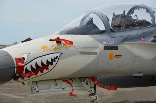 據臺灣媒體報道,為紀念對日抗戰勝利70周年,臺空軍日前在新竹空軍基地展示彩繪成二戰時期“中國空軍美籍志愿大隊(即飛虎隊)”鯊魚頭涂裝的IDF與F-16戰機。機上繪有日本國旗,象征戰時被擊落的日本戰機。