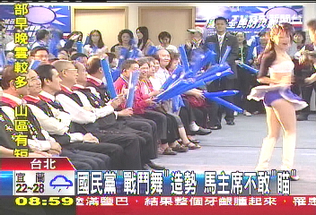 穿著超短迷你裙的舞者,在只隔馬英九不到半米的距離,蹦蹦跳跳一點也不怕走光,令人臉紅心跳;這也讓馬主席的眼睛視線不敢亂飄,一旁的吳敦義和王金平手叉在胸口,看得倒是很專心。(芮文輝)