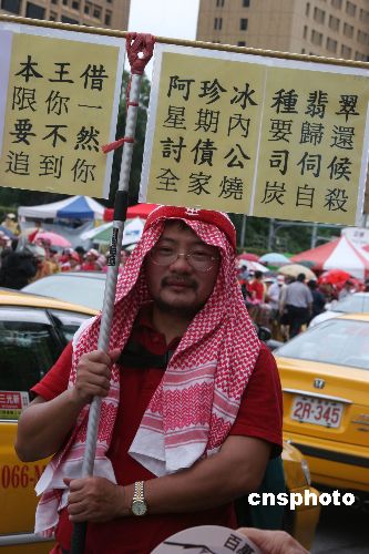 9月11日,百萬人民反貪腐倒扁靜坐進入第三天。圖為一名身穿紅衣的男子扮成“中東王子”,在凱達格蘭大道路邊走來走去。 中新社發 董會峰 攝