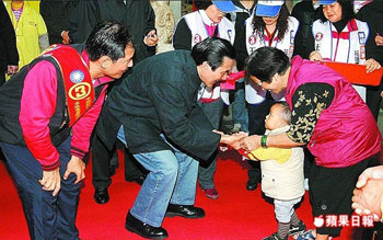馬英九(中)在花蓮發(fā)紅包,遇上幼童就問(wèn):“知不知道我是誰(shuí)?”來(lái)源:臺(tái)灣《蘋(píng)果日?qǐng)?bào)》