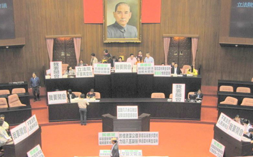 國民黨籍“立委”一早進入“立法院”議場,占據(jù)主席臺、發(fā)言臺,并放置“我要開會”等抗議廣告牌,要求民進黨團不要再亂;民進黨團則在議場內(nèi)研議議事攻防。