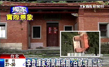 谷歌地圖(google earth)在臺灣又惹上麻煩事,繼之前拍到窗臺裸女及路口“尿尿男”后,日前有民眾在谷歌地圖上發現,李登輝的住家“翠山莊”旁邊有一間“麻將館”,誰知警察前往調查時,卻發現被標為“麻將館”的地方其實是空置的三合院。