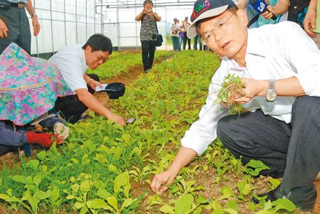 表態(tài)參選后的楊秋興希望綠營大老不要為難他,昨天他繼續(xù)走自己的路,參訪農(nóng)場時蹲下幫忙摘除雜草。圖片來源:臺灣中國時報