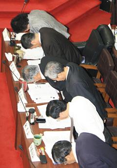 陳菊(穿灰衣者)28日在市議會(huì)答詢時(shí),率高雄市政府官員鞠躬致歉。 來源:臺(tái)灣《聯(lián)合報(bào)》