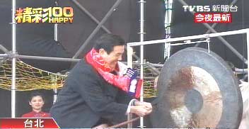 昨(1)日是元旦,為表慶祝,馬英九下午大筆一揮,當(dāng)眾揮毫漢字;寫完毛筆,馬英九架勢十足的欲敲吉祥鑼鼓,還蹲馬步用力一敲,未料用力過猛將鼓棒敲“飛”,惹得現(xiàn)場人員大笑不止。隨扈見此連忙將鼓棒撿回,馬英九則重敲鑼鼓。