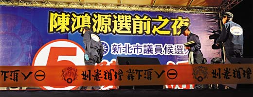 連勝文在陳鴻源的造勢晚會站臺助選,被“馬面”林正偉朝頭部開槍,圖為案發(fā)后,警方封鎖現(xiàn)場采證。圖片來源:臺灣《聯(lián)合報(bào)》