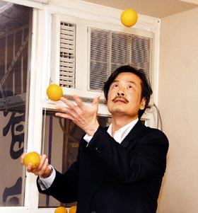 卸下國民黨秘書長職務,金溥聰顯得格外神清氣爽,他兌現承諾,在媒體面前表演拋接三顆橙子的技藝。圖片來源:臺灣《聯合報》