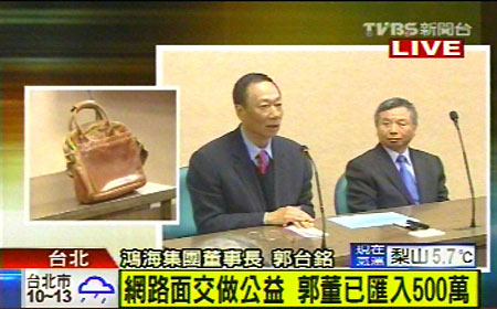 據臺灣TVBS電視臺消息,臺灣鴻海集團董事長郭臺銘以500萬元(新臺幣,下同)標下了前“衛生署長”楊志良的公事包,兩人今日相約面交。楊志良表示,他除了感謝郭臺銘的善心之外,也對許多熱情的網友表示感謝,對網友們的出價競標相當感動。