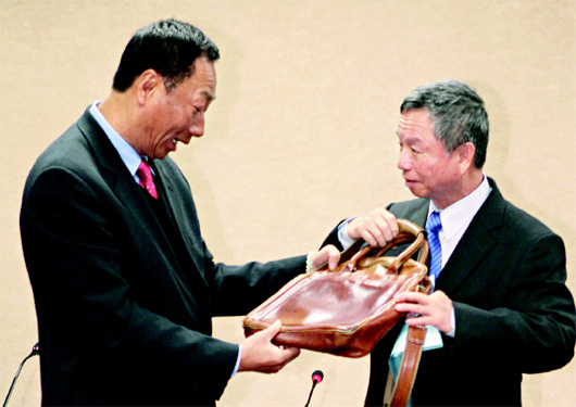 臺當局前“衛生署長”楊志良(右)公益拍賣隨身公文包,鴻海集團董事長郭臺銘(左)得標后,昨天在臺大公衛學院面交。楊志良在公文包簽名及寫下“感恩”兩字,郭臺銘則簽名寫下“好膽愛心包”還贈楊志良。圖片來源:臺灣《聯合報》