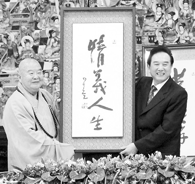 圖為星云向陳云林贈送書法作品。