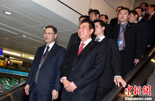 2月23日中午,應臺灣海基會董事長江丙坤之邀,海協(xié)會會長陳云林率海協(xié)會經(jīng)貿考察團搭機抵臺。圖為陳云林(前右)一行在海基會副董事長高孔廉陪同下,乘滾動扶梯進入桃園機場一樓入境大廳。中新社記者 董會峰 攝