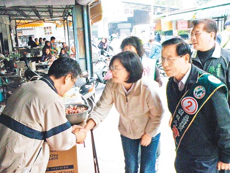 民進(jìn)黨提名的臺南“立委”補(bǔ)選參選人許添財(cái),昨天上午由蔡英文陪同前往市場拜票。