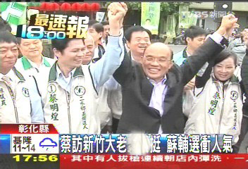 蘇貞昌今日南下彰化為候選人輔選,支持者高喊“凍蒜(當(dāng)選)”。圖片來源:臺灣TVBS電視臺