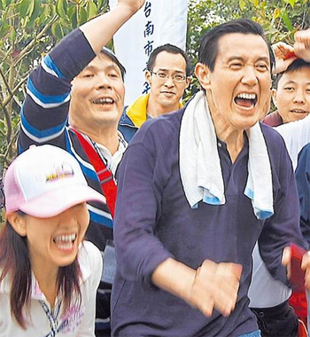 27日,馬英九登上臺南市大凍山頂峰后,開心地和國民黨青年軍高呼口號。 來源:臺灣媒體