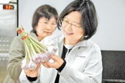 蔡英文27日走訪云林,接過當(dāng)?shù)刂С终咦K皟鏊狻钡乃忸^,頻頻稱贊“這蒜頭好漂亮!”