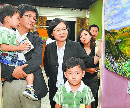 蔡英文27日在輔選會頻動怒,隨后轉換心情欣賞已故畫家張淑玫畫展,張淑玫的丈夫、幼兒一路陪同。圖片來源:臺灣媒體