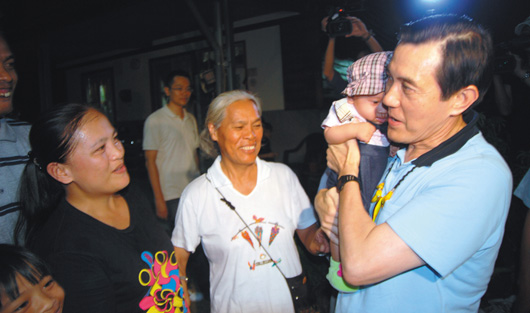 馬英九(右)經(jīng)過大社部落時,特別探視風(fēng)災(zāi)兩年后大社部落的第一個新生兒陳琳。圖片來源:臺灣《聯(lián)合報》