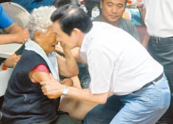 昨天,馬英九來到臺南臺風重災區恒春鎮慰問災民,一老人談到水淹家園時,不禁淚流滿面,馬英九當即給予一個溫暖的擁抱。圖片來源:《中國時報》