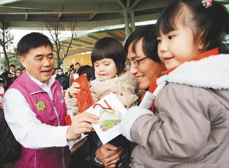 臺(tái)北市長郝龍斌昨天下午現(xiàn)身花博園區(qū),發(fā)送1000份春聯(lián)及紅包袋給游客。圖片來源:臺(tái)灣《聯(lián)合報(bào)》