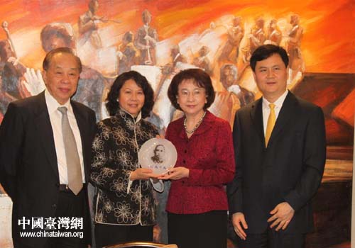 中山市副市長韓澤生(左二)、中山市副市長殷昭舉(右一)一起向林澄枝女士(右二)、謝孟雄先生贈送紀念品(圖片來源:中山市臺辦)