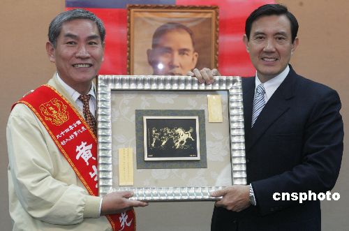 中國國民黨主席、臺北市長馬英九十二月十二日在臺北會見全臺好人好事“八德獎”獲獎代表時,一位代表贈送他一幅“九馬圖”,祝其前程遠大。作者:宗金柱