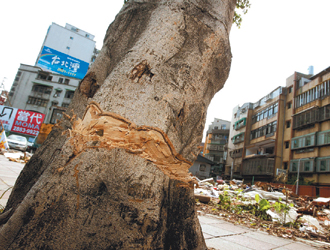 據臺灣《聯合晚報》報道,臺北市“議員”接獲民眾檢舉,承德路四段某建地行道樹遭“齊平斷根”,更有一株超過三層樓高的行道樹遭到“環狀剝皮”,瀕臨死亡。另外,某街的高級建案尚未開工,建商已悄悄將樹木“斷枝”,再把鋸斷處包裹起來。像這樣傷痕累累的行道樹,在臺北市隨處可見。