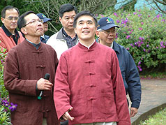 臺北市陽明山花季二日正式開幕,市長郝龍斌(前)身著唐裝上山賞花。
