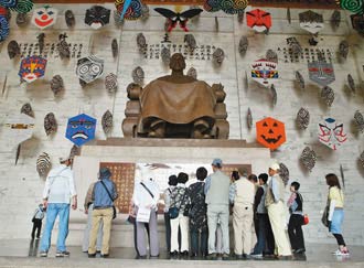 中新網3月27日電 國民黨贏得臺灣地區領導人選舉。被臺當局更名為“民主紀念館”的臺北中正紀念堂的蔣介石銅像也將“出關”。蔣銅像周圍掛起的風箏、臉譜、拼板舟及綁著抗議頭帶的展示架,都將在3月31日閉館后拆除;4月1起,銅像大廳將恢復昔日的氣氛。