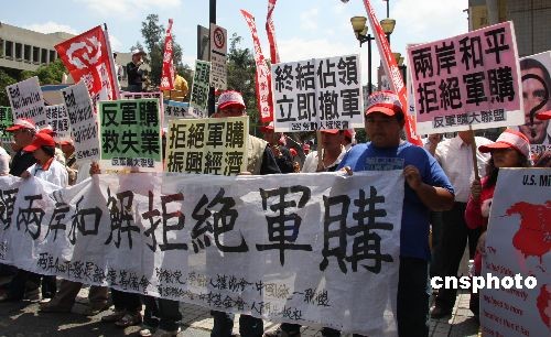 中新社臺北五月一日電 (記者 耿軍 鄧敏)臺灣十四個團體五月一日舉行“反軍購,要和平”示威集會,呼吁執政當局在兩岸關系愈趨平和、互動良好的情況下,實在沒有必要再花千億搞軍購。