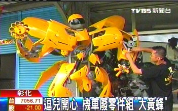 用摩托車零件組裝的“大黃蜂”。圖片來(lái)源:臺(tái)灣TVBS