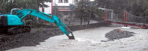 災情最嚴重的是冬山鄉(xiāng)的太和村,上游的十三份溪在上次芭瑪臺風來襲時,溪里大量土石淤積,還來不及全部清除,這次又逢大雨,溪水暴漲淹到路面,多條農(nóng)路封閉。縣府工務處緊急出動3臺挖土機疏浚十三份溪,避免溪水的水位持續(xù)升高,造成更嚴重的災情。