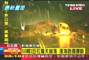 臺(tái)灣TVBS電視畫(huà)面截圖 巨石砸斷公路。