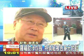 據(jù)臺(tái)灣TVBS電視臺(tái)報(bào)道,臺(tái)特偵組偵辦前“立委”羅福助涉嫌炒股案,經(jīng)過2年監(jiān)聽,今日下午羅福助以被告身份首度被臺(tái)特偵組約談,地點(diǎn)在北機(jī)組。被約談?wù)叱_福助之外,也同步約談證券商及金主等;原本昨日就要約談羅福助,羅福助臨時(shí)請(qǐng)假改在今日下午才向臺(tái)檢調(diào)部門說明。