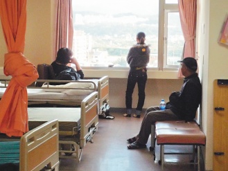 林姓出租車司機(左)和同居女友燒炭自殺獲救,他的大陸配偶(中)到醫院探視發現丈夫另有女人,痛苦遠望;林父(右)也一臉無奈。來源:臺灣《聯合報》