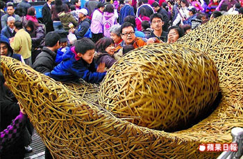 南投紫南宮昨擁入逾10萬名信眾,搶著滾動藤編金元寶,祈求財(cái)源滾滾來。來源:臺灣《蘋果日報(bào)》