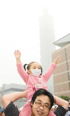 臺北101大樓籠罩在沙塵之中,家長為小朋友戴上口罩。圖片來源:臺灣《聯合報》